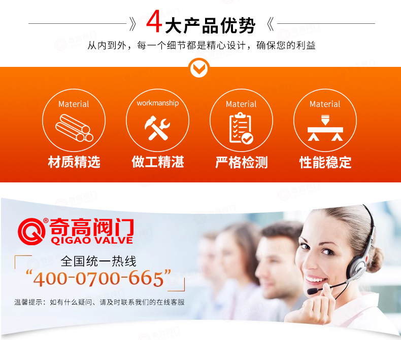 “奇高閥門”的期望,不斷提升服務(wù)質(zhì)量,精益求精,“真誠的服務(wù)”是“奇高”永恒的主題。“奇高”嚴(yán)格按照IS09001-2000 質(zhì)量體系認(rèn)證要求,質(zhì)量嚴(yán)格把關(guān), 責(zé)任到人,確保生產(chǎn)、銷售、服務(wù)的健康運(yùn)行。加強(qiáng)與用戶溝通,竭誠為廣大客戶提供優(yōu)良產(chǎn)品,貼心服務(wù)。特此我廠做出以下承諾: