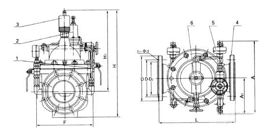 1、球閥2、導閥3、流量調節閥4、主閥5、壓力表6、針閥