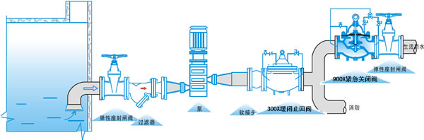 900X緊急關閉閥用于生活供水和消防供水并聯供水系統中,正常情況供生活用水,當火災發生時消防用水時,閥門自動關閉生活用水,確保足夠的消防用水。當消防停止用水時壓力減少,閥門自動恢復生活用水,該閥使系統無須另設專門的消防單獨供水管網,大大地節省了工程建設成本和日常的用水量。該閥控制靈敏、可靠、調試簡單、使用壽命長。