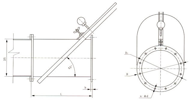 在垂直管道(氣流向上)上插板以45度逆氣安裝。其公稱直徑指管道外徑值。