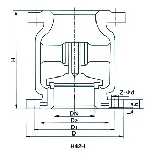H42H、H42W立式止回閥正常處于關閉狀態,由于管線中進口端介質的壓力作用,而克服彈簧阻力使閥門開啟。當進口端介質壓力低于出口端時,彈簧將閥芯推向閥座而使閥門關閉,阻止介質逆流,故起止回作用。